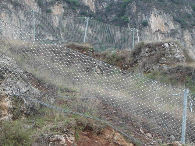 材質(zhì):鋼絲繩網(wǎng)、支撐繩和減壓環(huán)構(gòu)造:由鋼絲繩網(wǎng)或環(huán)形網(wǎng)(需攔截小塊落石時(shí)附加一層鐵絲格柵)、固定系統(tǒng)(錨桿、攔錨繩、基座和支撐繩)、減壓環(huán)和鋼柱四個(gè)主要部分構(gòu)成。