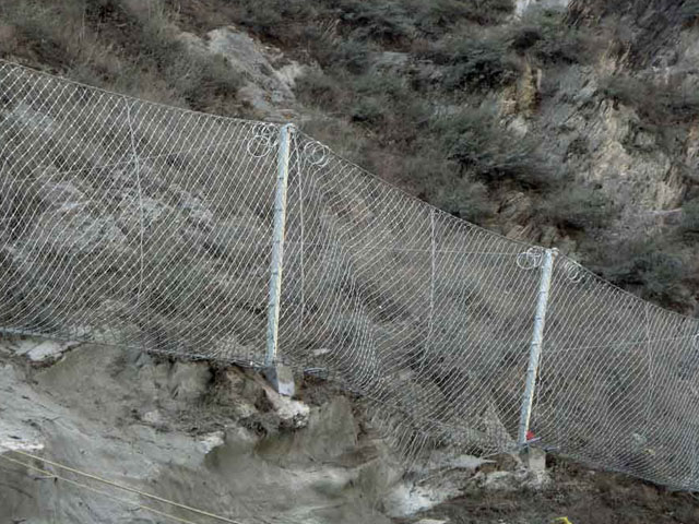 被動(dòng)防護(hù)網(wǎng)的柔性和攔截強(qiáng)度足以吸收和分散傳遞500KJ以?xún)?nèi)的落石沖擊動(dòng)能,消能環(huán)的設(shè)計(jì)和采用使系統(tǒng)的抗沖擊能力得到進(jìn)一步提高SNS被動(dòng)防護(hù)網(wǎng)與剛性攔截和砌漿擋墻相比較,改變了原有施工工藝,使工期和資金得到減少。